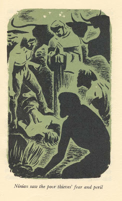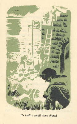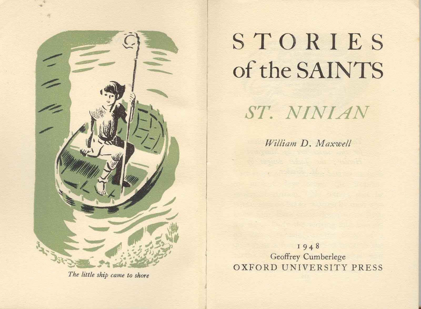 St Ninian of Whithorn, the Saint who built the first stone church in Scotland in 397AD. Published by Oxford University Press in 1948, it was written by William D. Maxwell. The two-colour illustrations are by Margaret Horder with cover designed by V.M. Kimber.