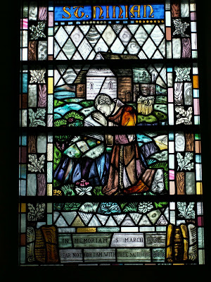 The windows flanking the pulpit of St Ninian’s Church of Scotland, in Whithorn are by Alexander Kerr. To the left of the pulpit is the Good Shepherd, while St Ninian is depicted on the right. The stained-glass was commissioned by Jane Jenkins and the Good Shepherd window carries the inscription, “To The Glory of God These windows are Gifted by Jane Weir Jenkins, Widow of Ross Townsend Jenkins and Daughter of Gemmell Hutchison R.S.A.” (Royal Scottish Academy)