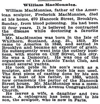 William MacMonnies was a native of Whithorn. He emigrated to the United States and made a fortune in the grain business which he lost during the civil war. William married Juliana Eudora West, who was a relation of Benjamin West the history painter and President of the Royal Academy of Arts in London. Their son, born in 1865, was Frederick William MacMonnies who became a member of the great trio of late 19th century American sculptors with Daniel Chester French and Augustus Saint-Gaudens. Indeed, it was the studio of Augustus Saint-Gaudens which Frederick entered as an apprentice in 1880. Four years later he left for Paris to study sculpture at the École des Beaux-Arts, winning the highest award given to foreign students twice. This encouraged him to open a studio in Paris where he began to create some of his most famous sculptures which he submitted annually to the Paris Salon. In Paris, he married a fellow American artist, Mary Louise Fairchild.