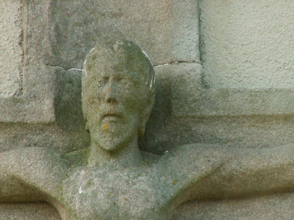 The Whithorn Crucifix was sculpted in 1959 and is sited above the Pilgrimage Altar at the rear of the Roman Catholic Church to SS. Ninian, Martin and John on George Street. The figure of Christ looks out over open fields to the Solway Firth. Sadly it has not weathered well and poor stone cleaning in 1997 has added to the loss of some detail. Despite this the crucifix retains a strong emotional power. Hew Lorimer had completed a similar firgure, the sculpture of Christ the King, for the Dawson mausoleum and Chapel in St Ninian’s Burial Ground, Fochabers.