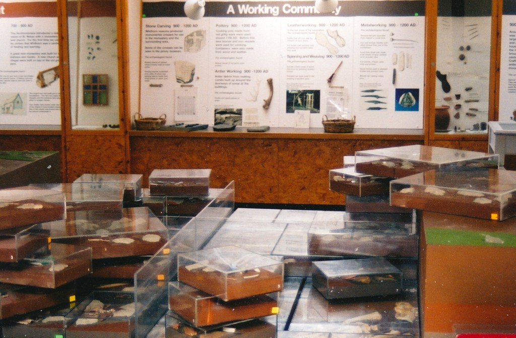 In order to explain this layering process to visitors, a special, large exhibition ‘The Discovery Room’ was created by the Whithorn Trust. Its centrepiece was a construction of Perspex boxes each holding partial reproductions of finds such as bones, pottery and metal objects from the Dig. These were set into different coloured, darkening backgrounds denoting depth of soil.